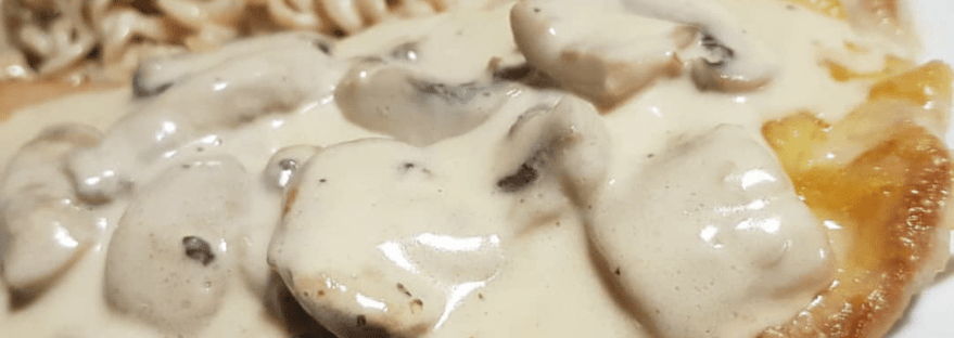 - Servir dans une assiette l’escalope, verser une ou deux grosses cuillères de crème au champignons par dessus. J’ai servi avec des pâtes (complete) que j’ai mélangé avec le restant de sauce.