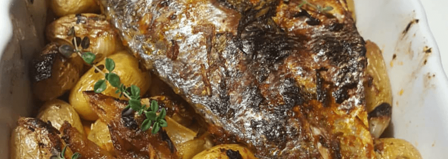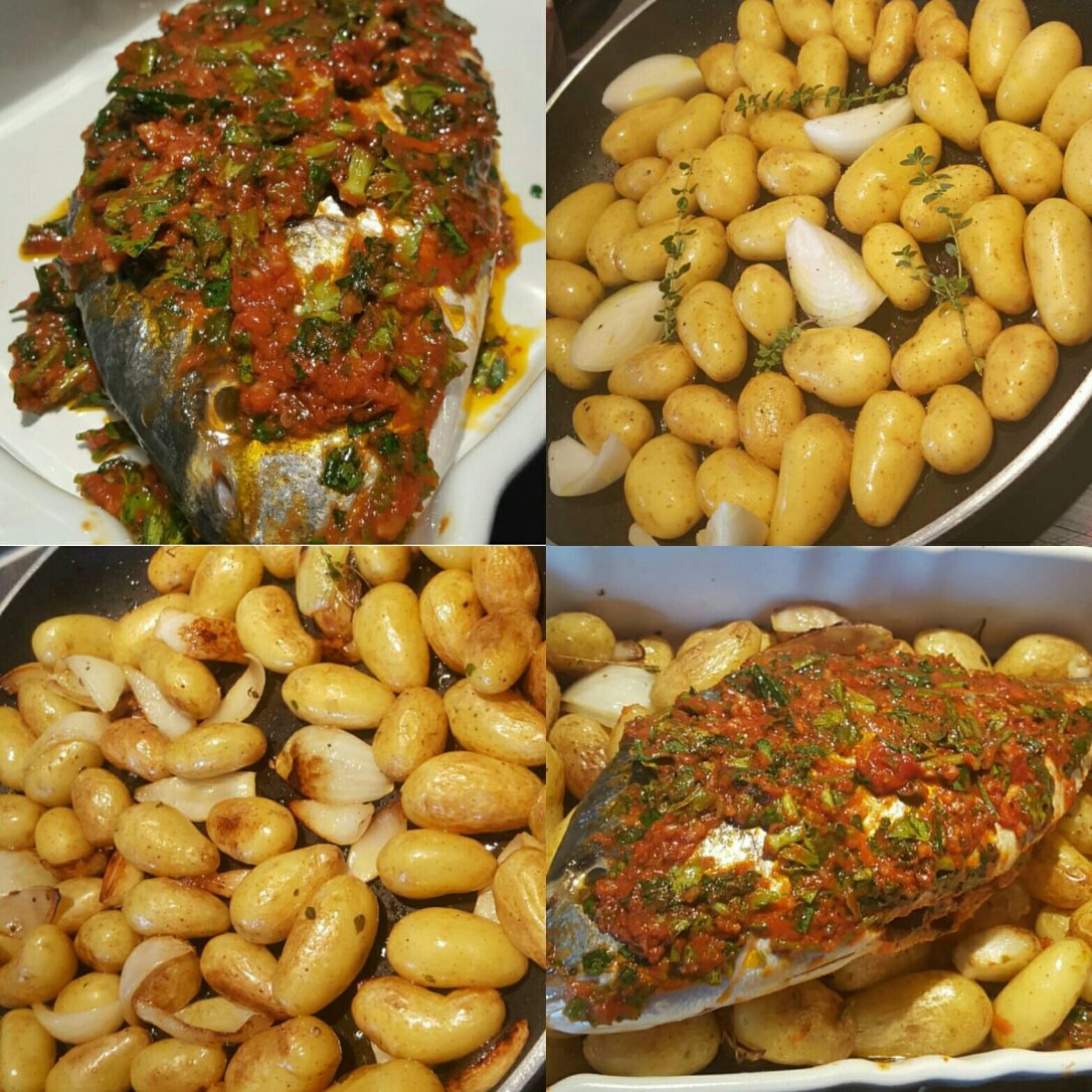 - Transvaser les pommes de terres dans un plat allant au four. Déposer le poisson dessus et enfourner dans un four préchauffé à 200°c environ 30minutes. Le retourner à mi cuisson. Puis finir la cuisson quelques minutes en mode grill.