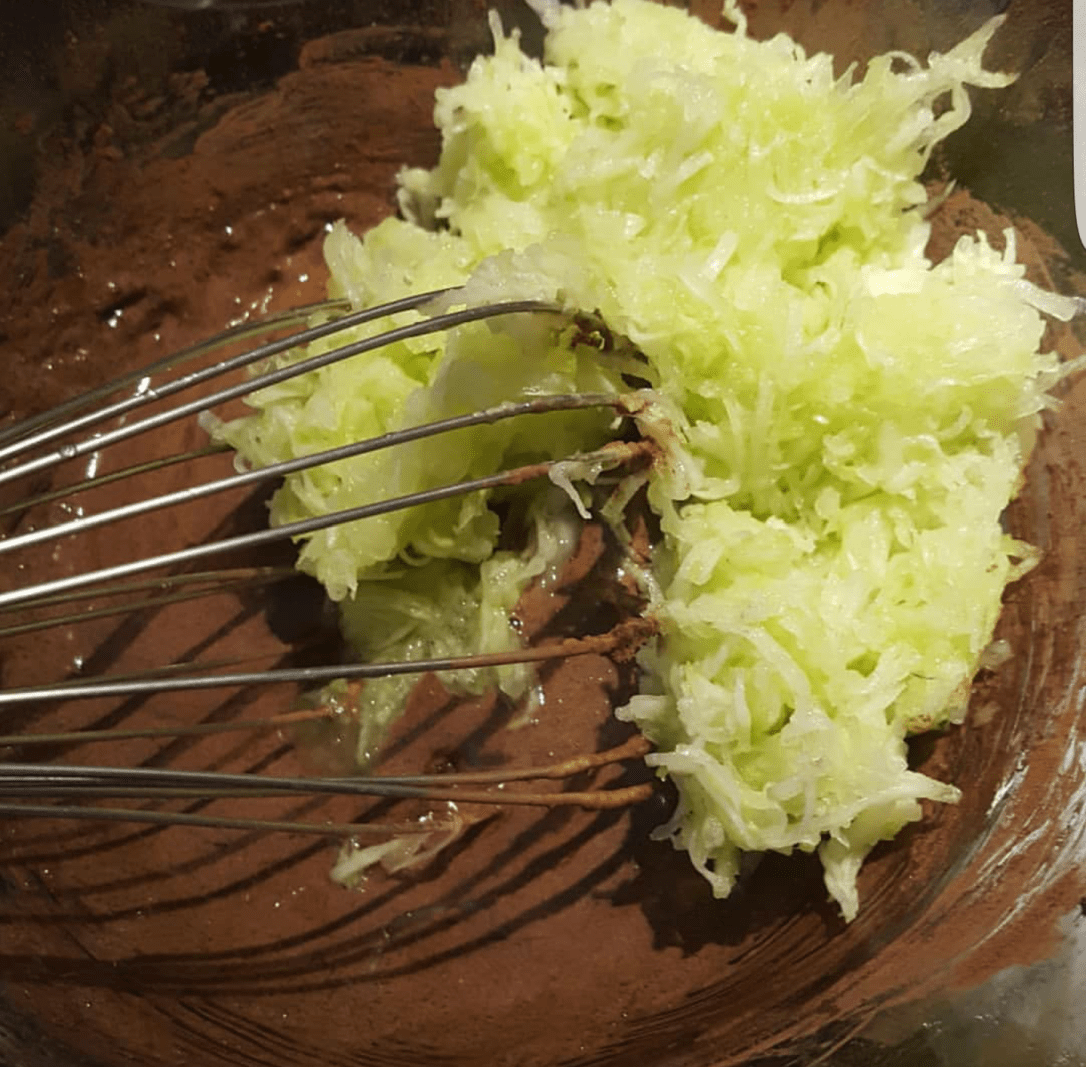 - Fouetter les jaunes avec le sucre et la vanille. Ajouter le cacao et la courgette. Mélanger.