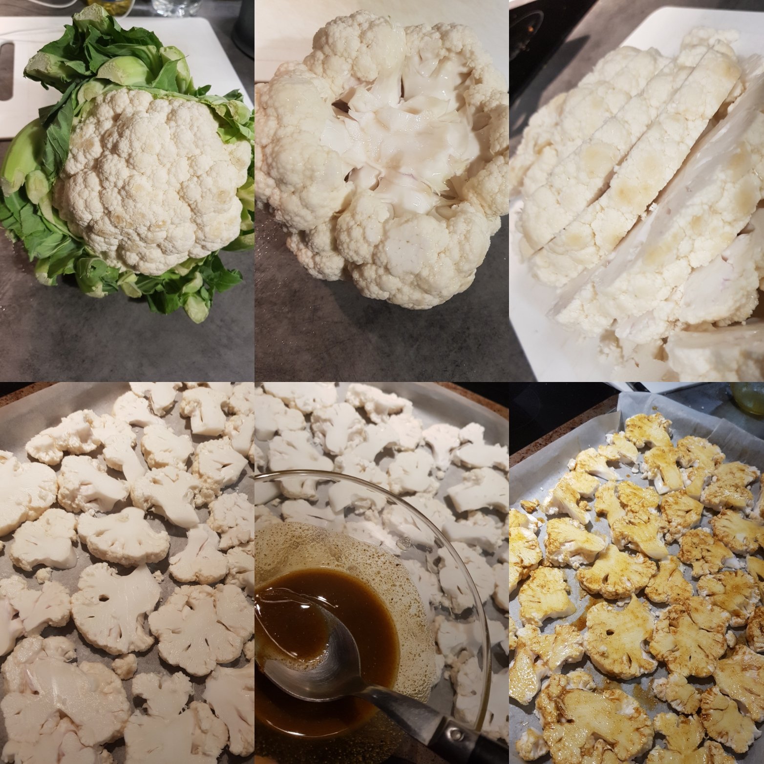 – Enlever les feuilles et le bout puis couper votre chou fleur en tranche. Séparer les morceaux délicatement. Les poser à plat sur une feuille de papier sulfurisé.