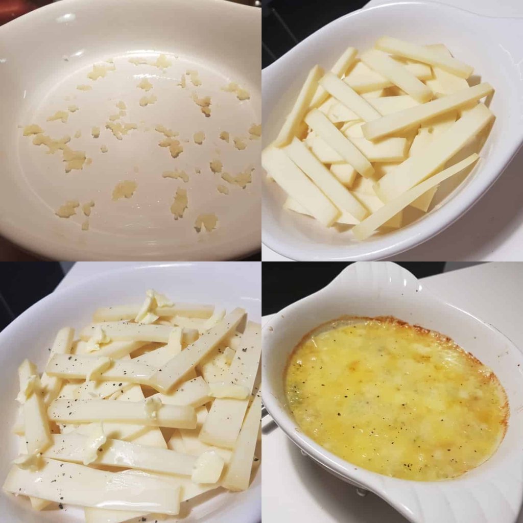 – Mélanger l’eau, le vinaigre et le sucre puis verser le tout sur le fromage. Poivrer et ajouter des tout petits morceaux de beurre par dessus.