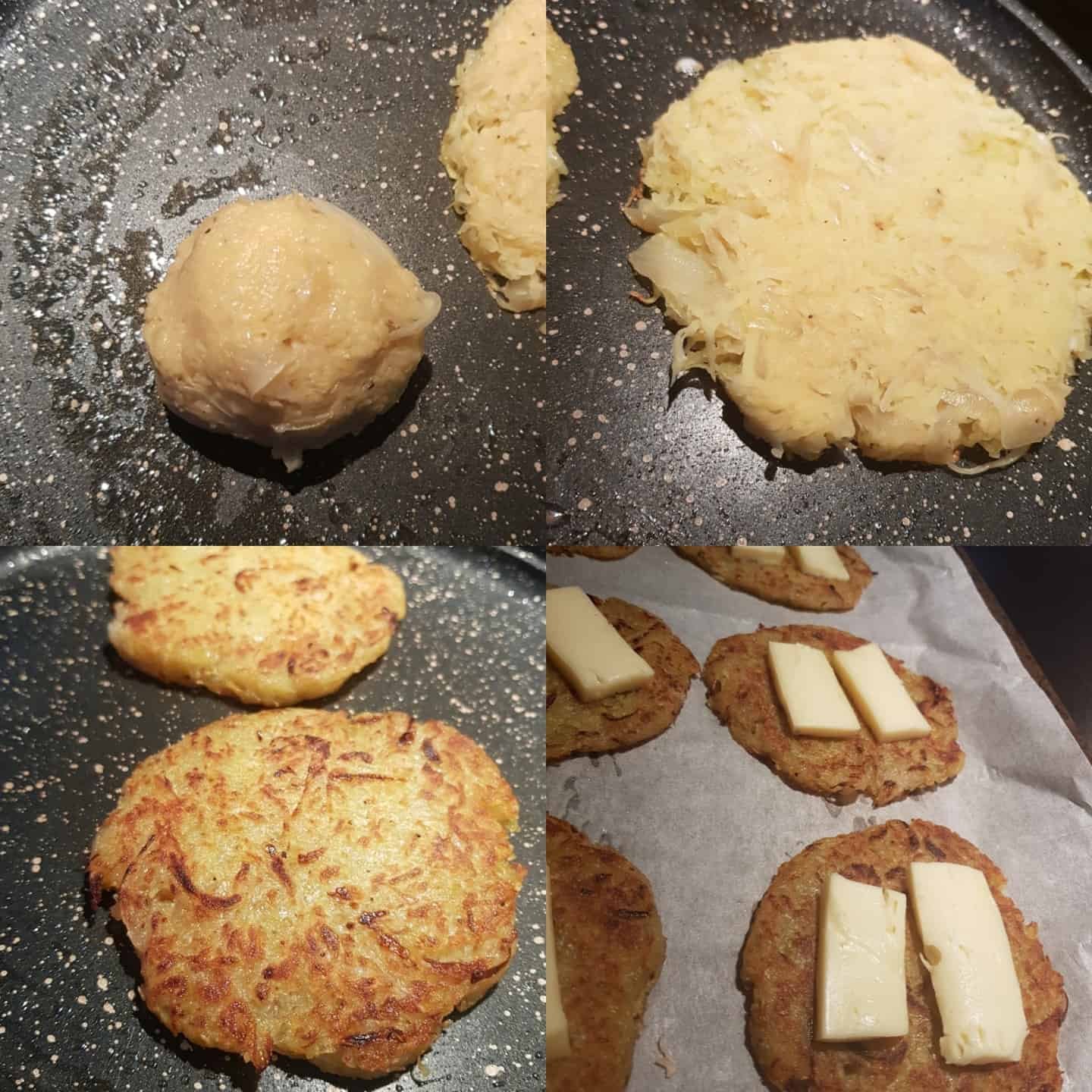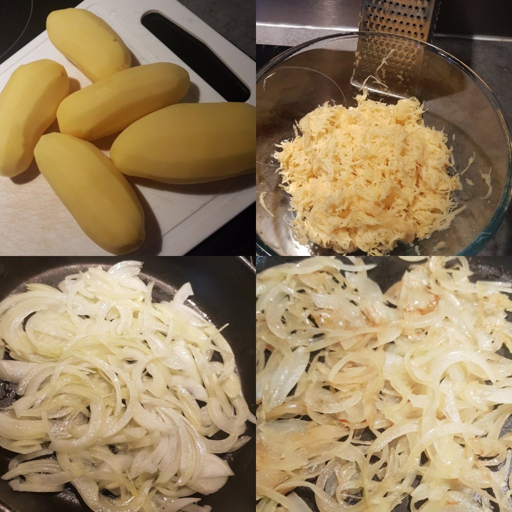 – Faire revenir l’oignon ciselé très finement puis mélanger avec les pommes de terre râpés.