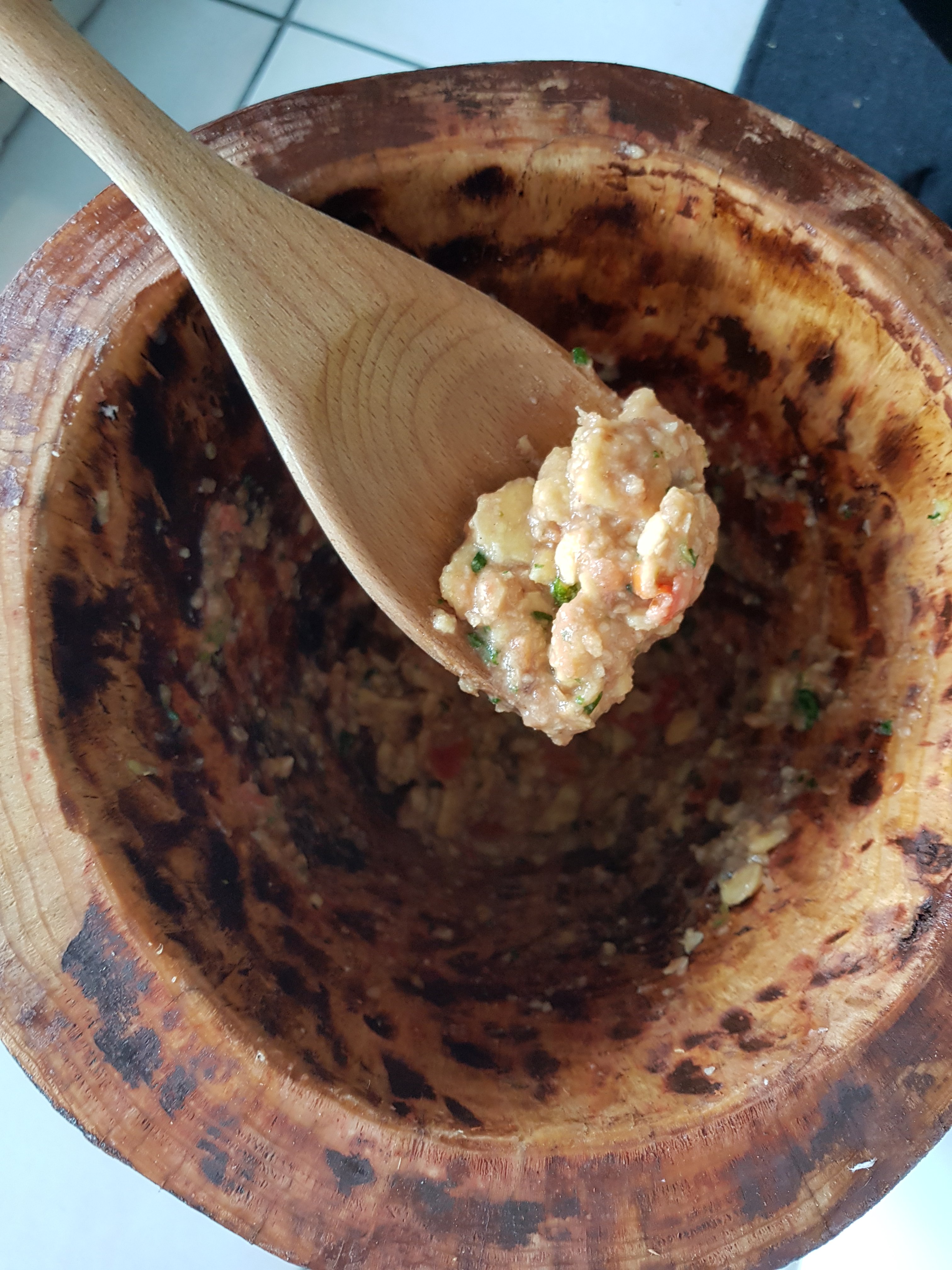 – Dans le mortier piler l’ail et piments puis ajouter les tomates et la coriandre coupé grossièrement, bien piler. Ajouter les morceaux de galette et piler en ajoutant un petit verre d’eau si trop sec. Saler et poivrer. Mélanger et servir toute suite.