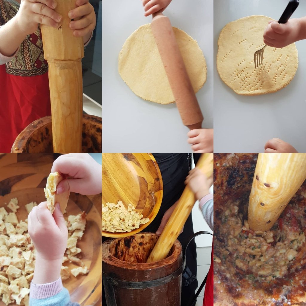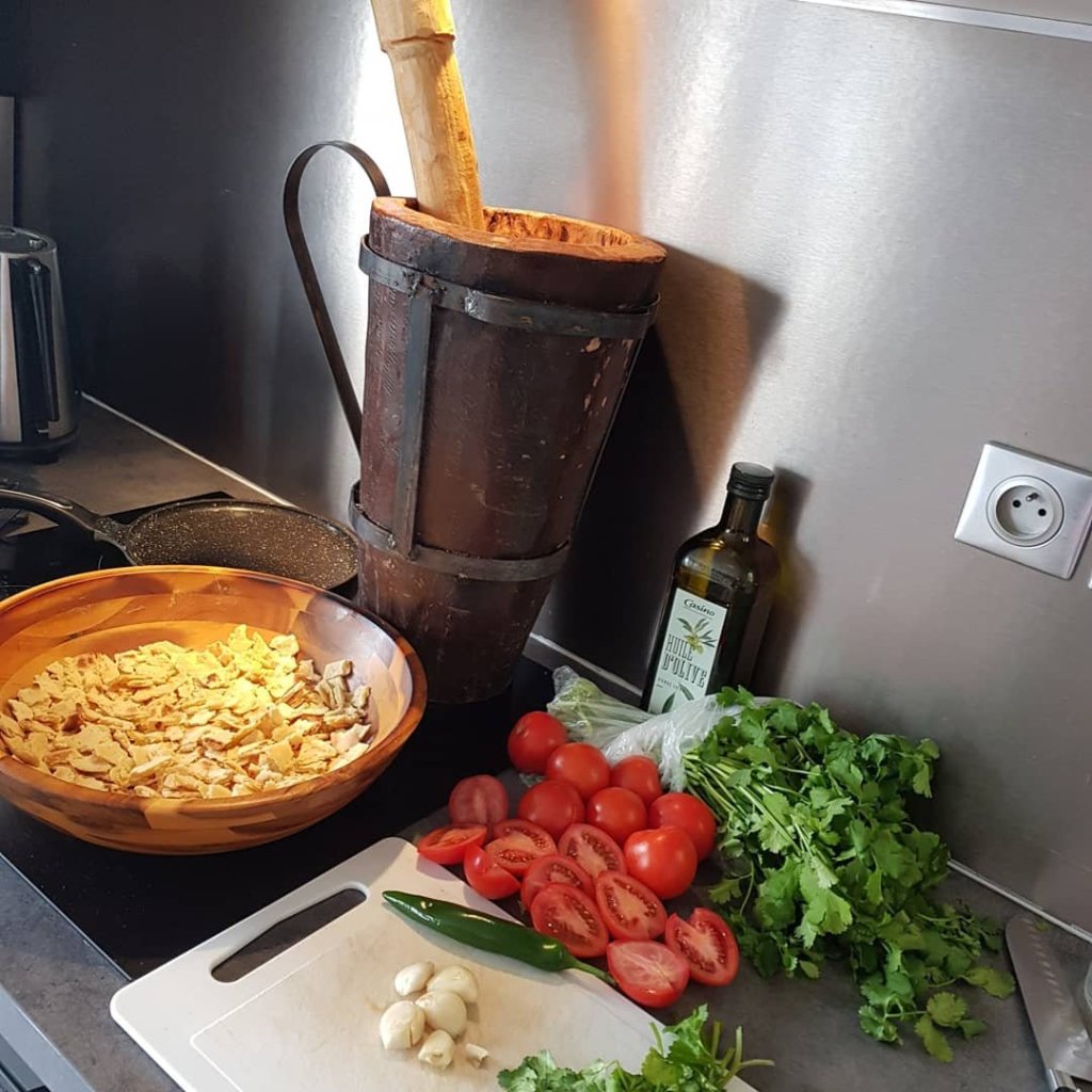 On le mange traditionnellement directement dans le mahress (mortier) avec des cuillères en bois. (À cause du virus on évite en ce moment, cette fois-ci j’ai servie dans des assiettes).