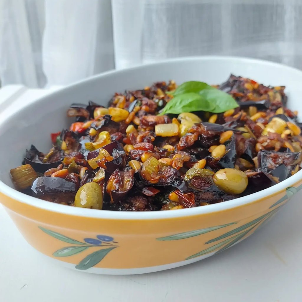 – Mélanger 3c.s de vinaigre rouge avec 1c.s de sucre en poudre. Verser le mélange dans la poêle puis éteindre le feu. Laisser reposer minimum 2h (encore meilleur le lendemain) servir avec du basilic frais ciselé.
