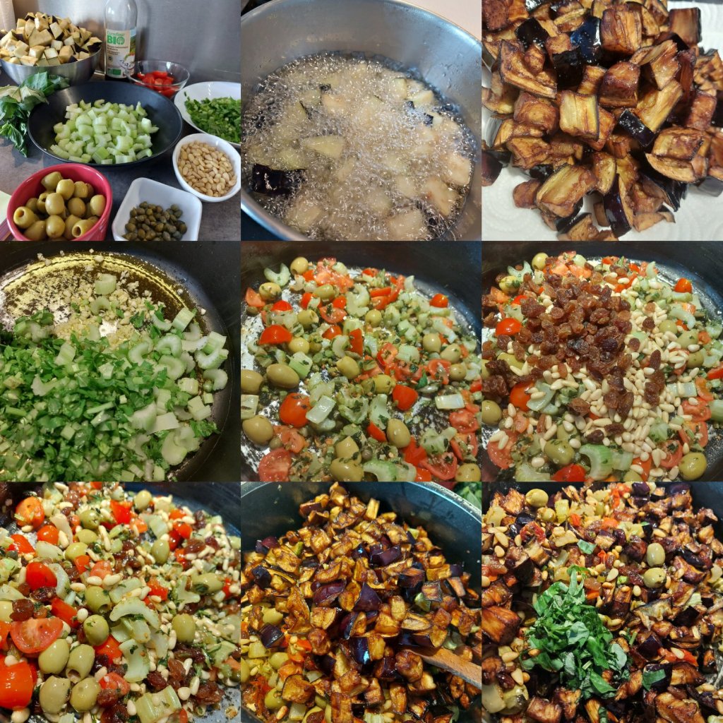 Dans une poêle faire revenir l’ail haché et le céleri dans un peut d’huile d’olive. Puis rajouter les câpres, les olives, les pignons, les raisins sec et 1c.s de sucre. Laisser mijoter quelques minutes.