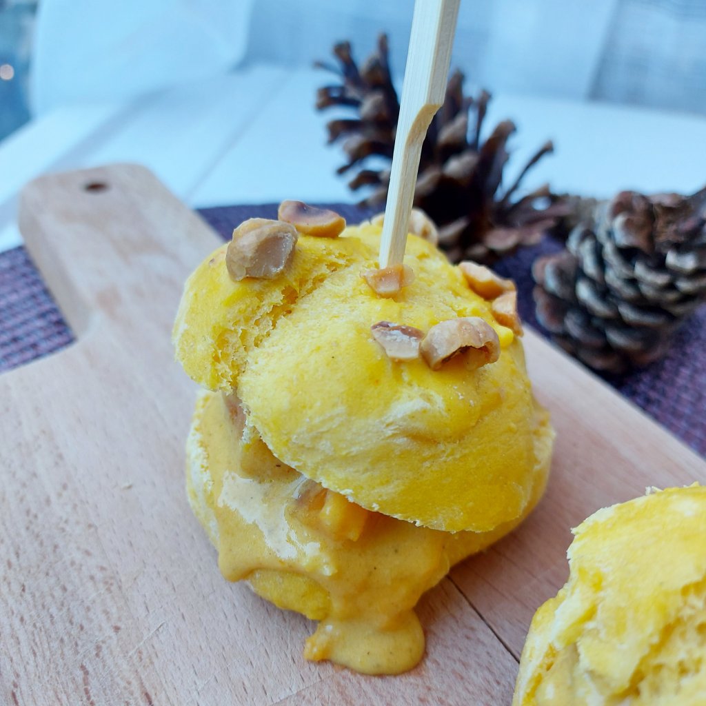 – Dans une poêle faite revenir les oignons ciselés quand ils commencent à dorer ajouter le potiron. Faire revenir quelques minutes puis ajouter le poulet, le curry, le sel et le poivre. Faire revenir quelques minutes puis verser la crème et l’ail haché. Laisser mijoter à feux doux une quinzaine de minutes puis ajouter le cheddar et le reste de purée de potiron des petites pains. Goûter verifier l’assaisonnement et rectifier si besoin sel, poivre….