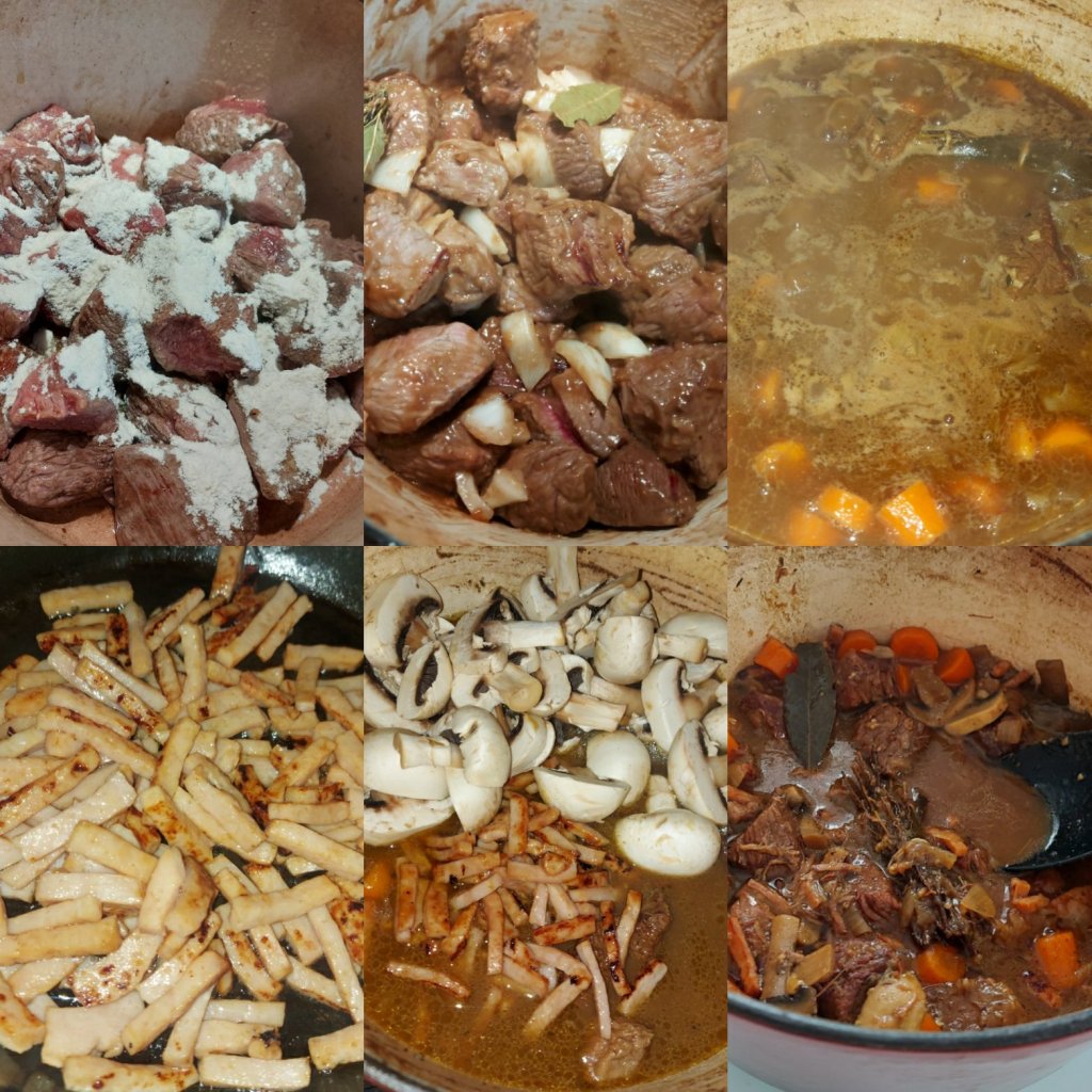 – Dans une poêle faire revenir les lardons dans un peut de matière grasse puis les ajouter dans la cocotte en même temps que les champignons coupé grossièrement.