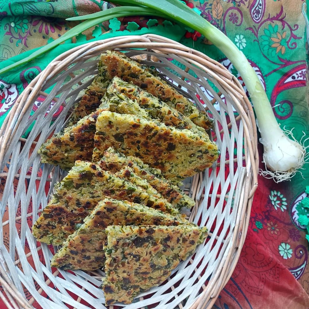 Galettes aux herbes, une recette typique de la cuisine Algérienne Kabyle appelé Aghroum Lahwal en Kabyle où Kesra bel 3shrab al 3tria كسرة بالأعشاب العطرة