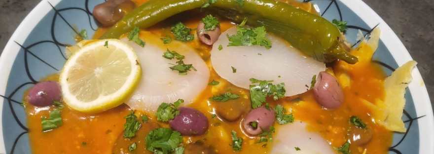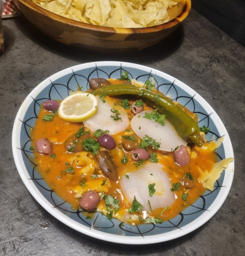 Sa sauce onctueuse et relevée, parfumée à l’ail, au piment, et épaissie avec de la farine, enveloppe délicatement chaque ingrédient. On y trouve de belles rondelles de navets, des fèves fondantes et des olives violettes, des morceaux de fines feuilles de pâtes de semoule (ftir),