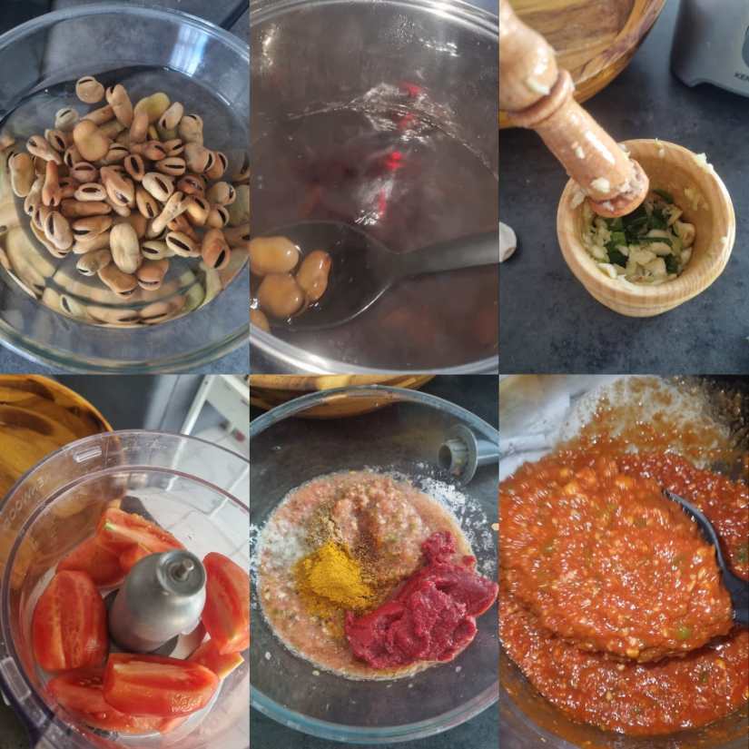 - Préparer les fèves : La veille, faire tremper les fèves, puis les cuire dans de l’eau à part puis réserver.