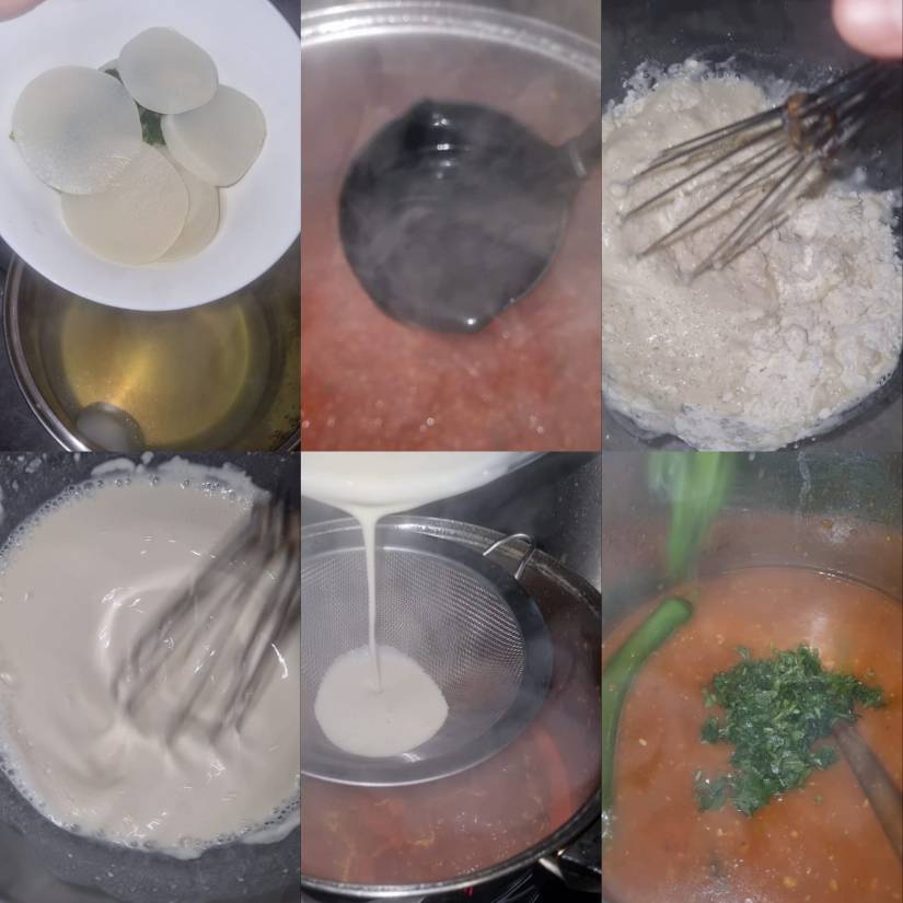 - Préparer le mélange eau + farine : Dans un saladier, mettre environ 3 bols d’eau et 1 bol de farine, puis mélanger jusqu’à obtenir un mélange homogène.