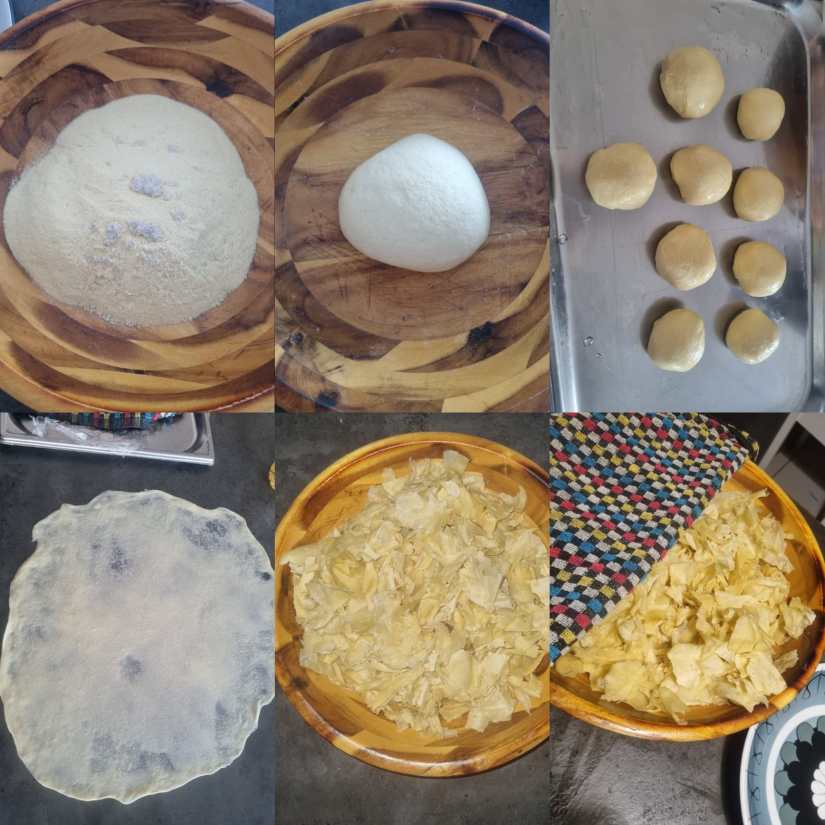 - Préparation des feuilles : On commence par préparer les feuilles. La méthode détaillée est la même que celle expliquée sur mon blog « safran et potiron » pour la recette de la chakhchoukha. Préparez-les à l’avance afin qu’elles soient prêtes pour le montage de la haasswa.